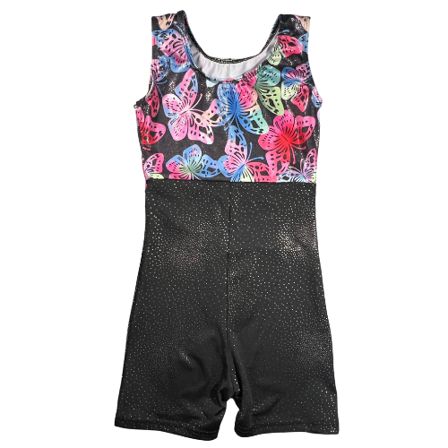 Girls' Shimmery Black Gymnastics Leotard with Colorful Butterflies