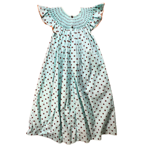 Mom & Me Aqua Smocked Dress with Brown Polka Dots and Rickrack - Little Girls' Size 6X
