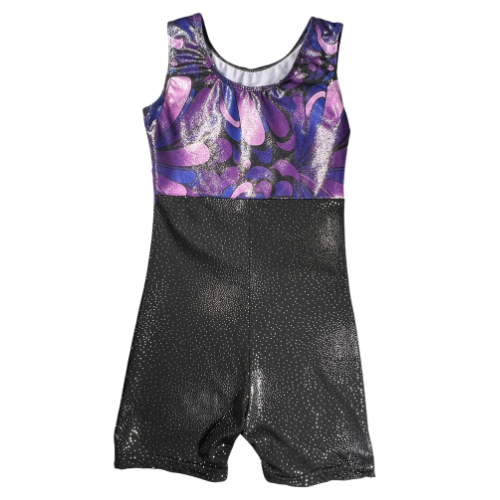 Girls' Shimmery Black Gymnastics Leotard with Purple Designs